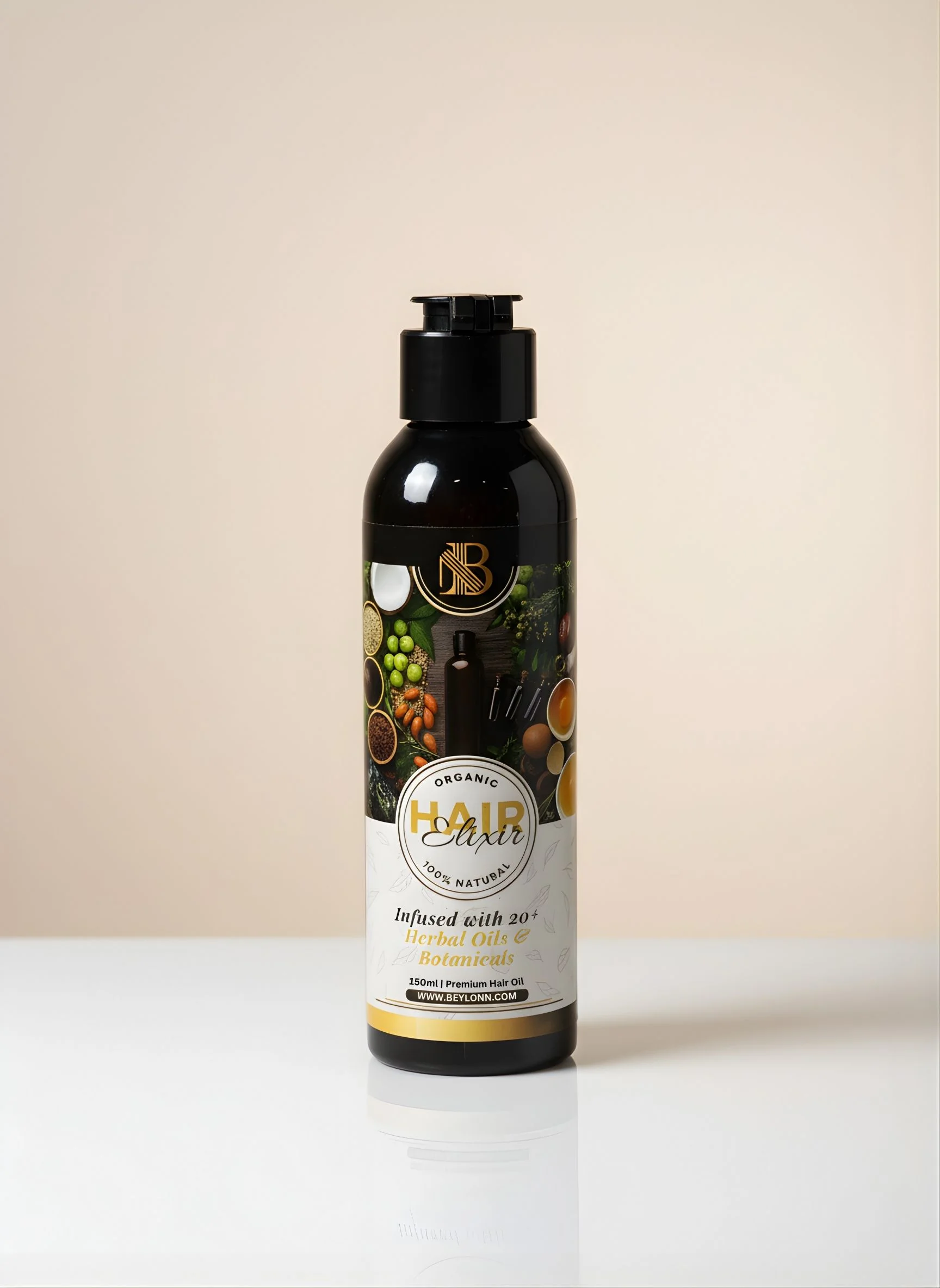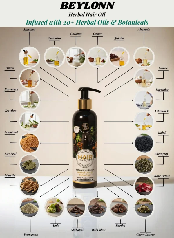 BEYLONN Hair Elixir is crafted with a luxurious blend of 10+ nutrient-rich cold-pressed oils and 10+ herbal extracts. Each ingredient is chosen for its proven benefits — helping strengthen roots, reduce hair fall, and promote natural shine without feeling sticky.